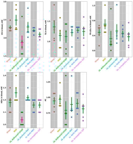 The lipid profile (i.e., Chl, TG, FR-LDLc and HDLc) for each animal group as well as the value of atherogenic coefficient (AC) calculated according to Nimmanapalli et al. [47] are presented in Figure 5. Among studied groups, there was no statistically-significant differences (p > 0.05) detected by all measured parameters. The exceptions were levels of Chl and HDLc that were significantly lower (p < 0.05) in the Lb100 group.