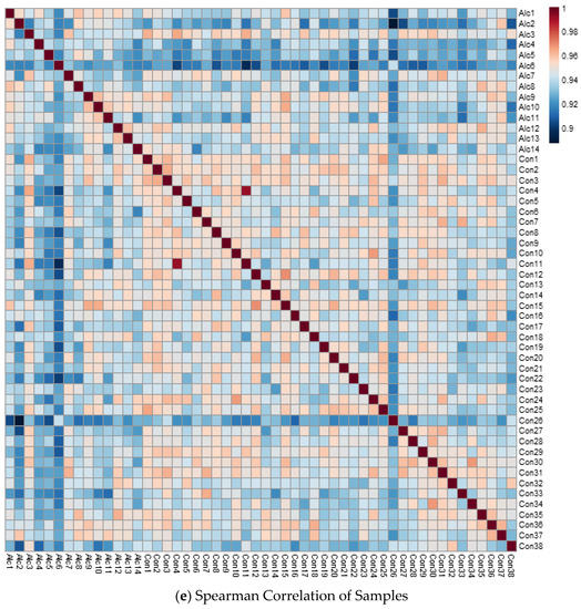 Multivariate analyses of metabolite profiles among pregnant women who consumed alcohol in the previous seven days and abstainers (n = 52). The analyses (a) Principal Component Analysis, (b) partial least squares—discriminate analysis (PLS-DA), (c) k-means clustering, (d) heatmap clustering, (e) Spearman correlation of samples were unable to separate women who consumed alcohol from abstainers. In the heatmap, a red to blue gradient represents the high, unchanged, and low abundance. In the correlation of samples, a red to blue gradient represent the positive, unchanged, and negative correlations. Alc denotes drinking within the past 7 days. Con denotes did not drink within the past 7 days.