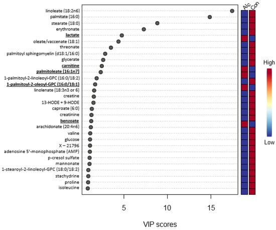 Variable importance projection (VIP) score plot with the top 30 metabolites that contribute to the separation of the metabolite profiles in Component 1 in the PLS-DA among women who consumed alcohol and abstainers. Bold metabolites were significantly enriched in those consuming alcohol. Red boxes denote an increased mean metabolite abundance. Blue boxes denote a decreased mean metabolite abundance. Alc denotes drinking within the past 7 days. Con denotes did not drink within the past 7 days.