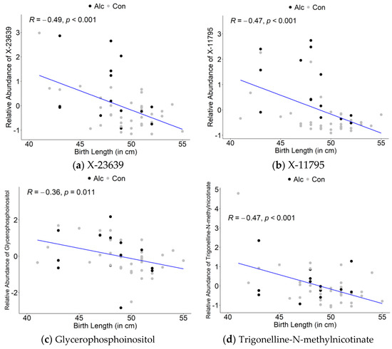Correlation plots of top metabolites identified in oPLSDA with infant birth length: (a) X-23639; (b) X-11795; (c) Glycerophosphoinositol; (d) Trigonelline-N-methylnicotinate. Alc denotes drinking within the past 7 days.