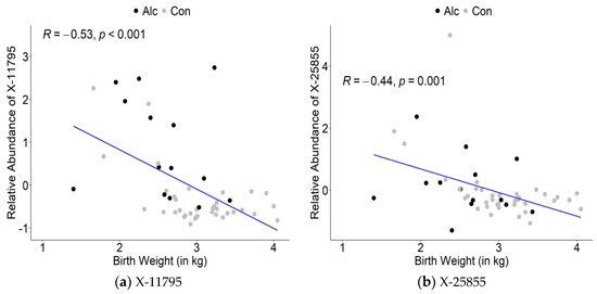 Con denotes did not drink within the past 7 days.Similarly, the top 30 maternal metabolites in the oPLS-DA that were correlated with infant birth weight were largely lipid-related (13, 43.3%) or unidentified compounds (8, 26.7%) (Table 4). Additional associations were found for glycerol-3-phosphate, myo-inositol, glutamate, glycine, sphingosine-1-phosphate, and cotinine. Again, nearly all (26 out of 30, 86.7%) were negatively correlated with infant birth weight with correlation values ranging from r = −0.53 to −0.22. Figure 4 shows the correlation plots for the top metabolites (X-11795, X-25855, gamma-glutamylglutamate, X-23639) which were all negatively associated with infant birth weight.