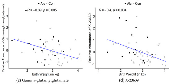 Correlation plots of top metabolites identified in oPLSDA with infant birth weight: (a) X-11795; (b) X-25855; (c) Gamma-glutamylglutamate; (d) X-23639. Alc denotes drinking within the past 7 days. Con denotes did not drink within the past 7 days.