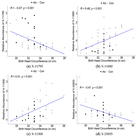 Correlation plots of top metabolites identified in oPLSDA with infant birth head circumference: (a) X-11795; (b) X-11880; (c) X-11308; (d) X-25855. Alc denotes drinking within the past 7 days. Con denotes did not drink within the past 7 days.