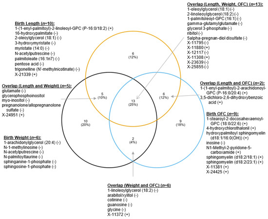 Overlap of metabolites associated with infant birth length, weight, and head circumference (OFC). (-) negative association with infant measure. (+) positive association with infant measure.