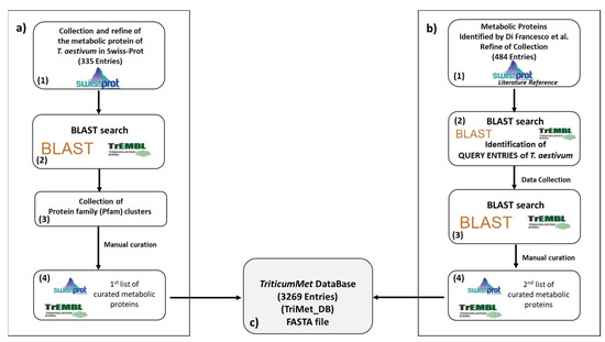 Scheme of the approach carried out to compile the manually curated TriMet Database. (a) Scheme of the approach that used as a starting point the complete list of Triticum aestivum entries reported in the Swiss-Prot section of the UniProt database; (b) scheme of the approach that used as a starting point the list of metabolic wheat proteins identified, by means of a MS-shotgun approach, in the recent work of Di Francesco et al. (Di Francesco et al., 2019) [31] (c) Number of sequence entries included in the TriMet_DB FASTA file.