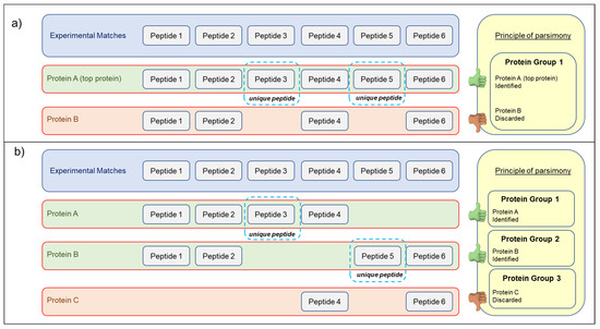 The fundamentals of Occam’s razor strategy (principle of maximum parsimony) in Proteomics, by which proteins can be related through shared matches, and used to create the final report of the identified proteins. (a) B is a subset of protein A. Protein B may be present in the sample, but there is no evidence for this, so parsimony may be dropped from the report. (b) Protein C can be considered as an “intersection protein” (i.e., a subset of the combined matches to A and B). By Occam’s razor, it may be discarded from the report because it is not identified by unique peptides.