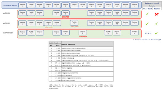 Occam’s razor strategy applied to assemble the fourteen analyzed peptide sequences (showed in the table on the bottom of Figure 6) into a list of identified proteins by searching both the Swiss-Prot and the manually curated TriMet database. See the main text for details.