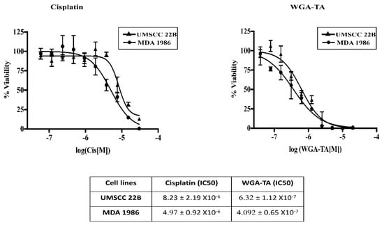 MDA-1986 and UMSCC-22B cells were treated with varying concentrations of either cisplatin alone or WGA-TA alone and the cell viability after 72 h was measured via MTS assay. The IC50 values (μM) shown below were calculated using GraphPad Prism.
