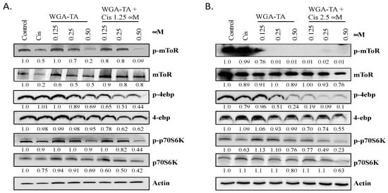 (A,B). Western blot showing treatment effect on the mTOR pathway and downstream substrates. MDA1986 cells were treated with varying concentrations of WGA-TA alone or in combination with 1.25 (A) or 2.5 (B) μM cisplatin as well as cisplatin alone for 24 h. Solvent treated cells were used as control. Cells were collected, lysed, and immunoblotted for mTOR pathway proteins.