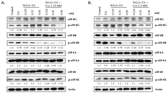 To investigate the effect that treatment has on translation initiation, a western blot analysis was carried out on critical eukaryotic translation initiation complex proteins. Our results indicate that neither WGA-TA alone nor WGA-TA in combination with cisplatin modulate levels of eIF4G, eIF4B, eIF4A, eIF4A1, eIF4E, or p-eIF4E at the concentrations used in this study. Nonetheless, p-eIF4G and p-eIF4B expression levels were significantly attenuated in combination treatments compared to untreated or single agent treatment (p < 0.01). While treatment with cisplatin or WGA-TA alone had no effect on p-eIF4G levels, combination treatment resulted in a 42–44% decrease in p-eIF4G (p < 0.01), thereby decreasing translation. In addition, treatment with 0.125–0.5 μM WGA-TA decreased p-eIF4B expression by 23–90% in a dose-dependent manner (p < 0.01 for 0.5 μM WGA-TA vs. untreated), whereas combination with 1.25 and 2.5 μM cisplatin resulted in a 54–92% and a 70–96% reduction in expression, respectively. Even at low concentrations of cisplatin, a clear combination effect can be seen. The synergistic effect of combination is most notable for treatment with 0.25 μM WGA-TA. An amount of 0.25 μM WGA-TA alone attenuated expression of p-eIF4B by 35%, whereas combination with 1.25 and 2.5 μM cisplatin reduced expression by 83% and 93% (p < 0.01 vs. drug alone at the same concentration), respectively. Treatment with cisplatin alone did not inhibit the expression of p-eIF4B.