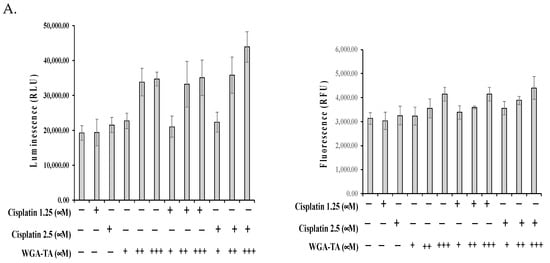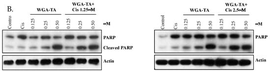 After determining IC50 values for each single drug treatment, combination treatment with WGA-TA and cisplatin was assessed. By calculating combination indices (CI) in response to dual-therapy treatment using the Chou-Talalay method [], the synergistic effect between the drugs was determined. Using this method, synergistic, additive, and antagonist effects are indicated by CI < 1.0, CI = 1.0, and CI > 1.0, respectively. A synergistic effect (CI < 1) was observed in both cell lines across a range of concentrations after 72 h treatment with cisplatin and WGA-TA (Table 1A). Combination treatment resulted in a significant decrease in cell viability when compared with single drug treatment (p < 0.01 for combination vs. either drug alone). To determine suitable concentrations of a drug for subsequent western blot analysis, combination indices for 24 h treatment of MDA-1986 with WGA-TA and cisplatin were calculated. At this shorter treatment duration, we redemonstrated that WGA-TA and cisplatin act synergistically when several different concentrations of WGA-TA are combined with 1.25 and 2.5 μM cisplatin (Table 1A,B).