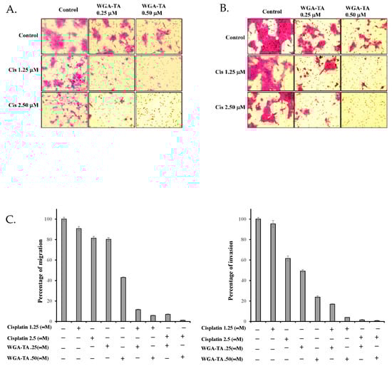Finally, the migration and invasion of MDA1986 cells after treatment with WGA-TA, cisplatin alone or in combination was assessed by Boyden chamber assay. The results shown in Figure 6A–C indicated a dose-dependent decrease in migration and invasion after treatment with either cisplatin or WGA-TA alone, whereas the combination treatment resulted in greater prevention of migration and invasion of cells even at 1.25 μM and 0.25 μM WGA-TA.