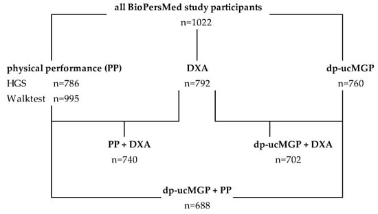 Flow chart of available measurements in the BioPersMed study participants: PP: physical performance; HGS: handgrip strength; DXA: energy X-ray absorptiometry; dp-ucMGP: dephosphorylated, uncarboxylated matrix-GLA-protein; n: number.