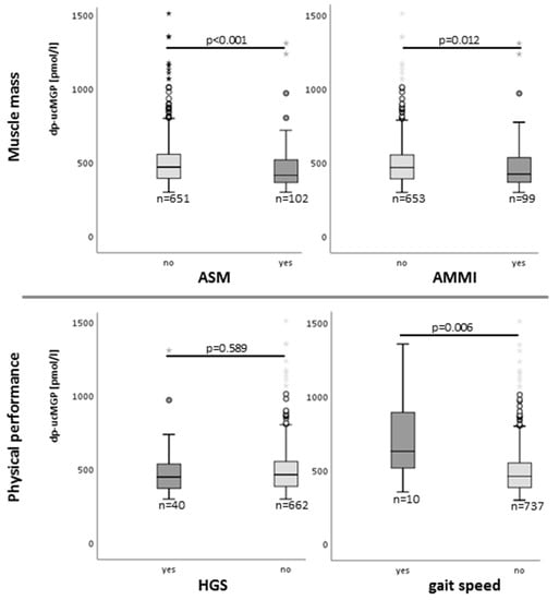 Dp-ucMGP levels in persons with and without reduced muscle mass or physical performance. Dark grey box plots represent the presence of decreased muscle mass or physical performance, whereas light grey boxes represent their absence. Dp-ucMGP: dephosphorylated, uncarboxylated Matrix-GLA-protein; pmol: picomol; L: liters, n: number; ASM: appendicular skeletal muscle mass; AMMI: appendicular skeletal muscle mass index; HGS: handgrip strength. Stars represent high extreme values and light or dark grey dots high potential outliers.