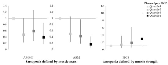Odds ratios for the association of dp-ucMGP quartiles with sarcopenia defined by AMMI, ASM or HGS.