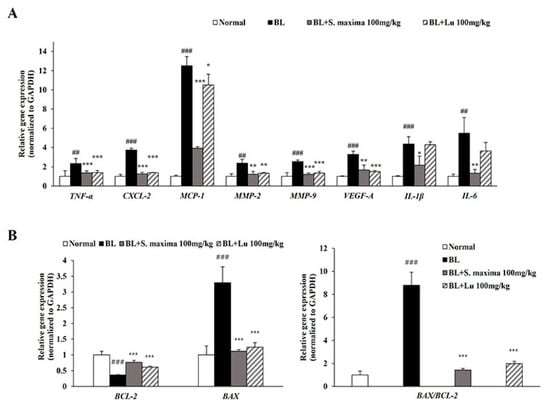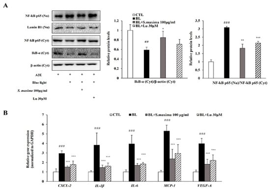 3.2. S. maxima Regulated the Inflammatory Response Caused by BL in A2E-Laden ARPE-19 Cells