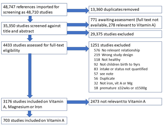 Electronic searches retrieved 48,747 titles and abstracts of potentially relevant studies on magnesium, iron and vitamin A, reduced to 35,347 on de-duplication and merging of papers into studies (Figure 1). Of these, 30,146 were excluded. The remaining 5201 papers underwent full-text assessment, but full texts could not be obtained for 775, of which 278 were potentially relevant studies of vitamin A (see Dataset Excel sheet 1 Awaiting Assessment, which is a list of studies that could be obtained in full text and re-assessed for inclusion for any future full systematic review). A total of 1251 were excluded (with reasons, see Figure 1), and 3175 included for one or more of the iron, vitamin A or magnesium scoping reviews; 899 contributed information on the topic of vitamin A and are represented in the Excel database (Figure 1). Some studies appear on several sheets.