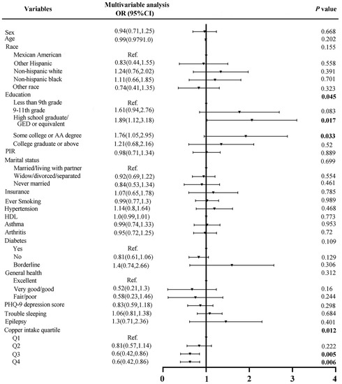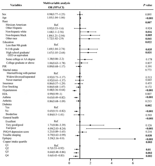 As shown in Table 2, there were 399 cases of stroke. All covariates were associated with stroke (p < 0.05), except for sex and HDL. The multivariate analysis (Figure 2) showed that the risk of stroke would increase by 1.05 times as the age increases by one year, p < 0.001. Subjects in non-Hispanic white, non-Hispanic black, and other race groups had a 1.68-, 1.89-, and 1.72-times higher risk of stroke than the Mexican American group, respectively, p < 0.05. The probability of stroke in subjects without hypertension was 0.48 times that of subjects with hypertension, p < 0.001. No history of asthma (OR = 0.63, p < 0.001), diabetes (OR = 0.65, p < 0.001), and trouble sleeping (OR = 0.79, p = 0.038) were all protective factors for stroke. However, fair/poor general health (OR = 4.09, p < 0.001) and epilepsy (OR = 5.59, p < 0.001) were risk factors for stroke. Most interestingly, the stroke risks of quartiles 2, 3, and 4 of dietary copper intake were 0.7 (p = 0.01), 0.64 (p = 0.003) and 0.6 (p = 0.002) times that of quartile 1, respectively.