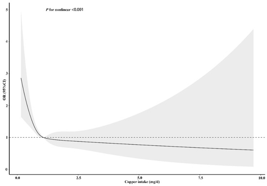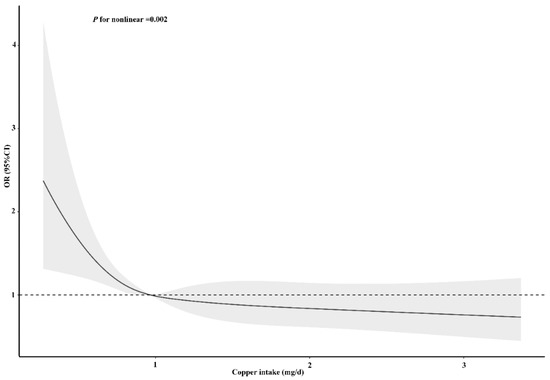 Restricted cubic spline models for the relationship between dietary copper intake and the risk of stroke after matching. The 95% CIs of the adjusted ORs are represented by the gray-shaded area. The model is adjusted for sex, age, race (Mexican American, other Hispanic, non-Hispanic white, non-Hispanic black, or other race), education (less than 9th grade, 9–11th grade, high school, graduate/GED or equivalent, some college or AA degree, or college graduate or above), PIR, marital status (married/living with partner, widow/divorced/separated, or never married), insurance, smoking, hypertension, HDL, asthma, arthritis, diabetes (yes, no, or borderline), general health (excellent, very good/good, or fair/poor), PHQ-9 depression score, trouble sleeping, and epilepsy. OR, odds ratio.