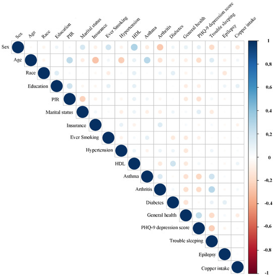 For stroke and control subjects, the associations between dietary copper intake and baseline data were evaluated (Figure 7 and Figure 8). Our results showed that copper intake was positively correlated with education (r = 0.15, p < 0.001), PIR (r = 0.08, p <0.001), smoking (r = 0.032, p = 0.001), hypertension (r = 0.03, p = 0.002), asthma (r = 0.03, p = 0.006), arthritis (r = 0.04, p < 0.001), diabetes (r = 0.04, p < 0.001), and trouble sleeping (r = 0.04, p < 0.001) but negatively correlated with sex (r = −0.15, p < 0.001), marital status (r = −0.05, p < 0.001), insurance (r = −0.035, p < 0.001), general health (r = −0.09, p < 0.001), and PHQ-9 depression score (r = −0.06, p < 0.001) in the control group. However, copper intake was positively correlated with education (r = 0.1, p = 0.036) but negatively correlated with sex (r = −0.12, p = 0.019) in the stroke group.