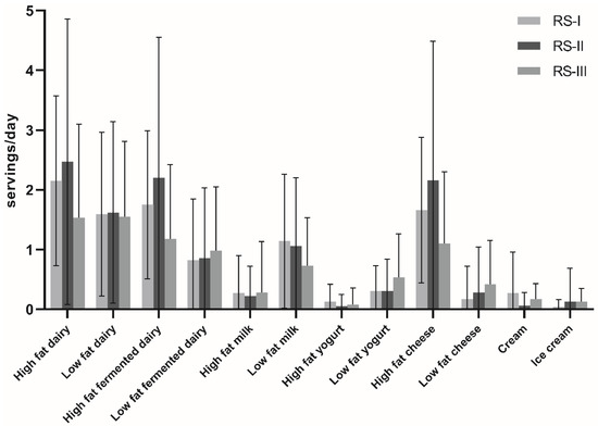 Dairy-type intake by cohort of the Rotterdam Studies in servings/day (mean ± SD): milk, 200 mL; yogurt, 150 mL; cheese, 20 g; cream 3 g; ice cream, 50 g. Combined total dairy category: liquid dairy products, 200 mL; cheese, 20 g. RS, Rotterdam Study.