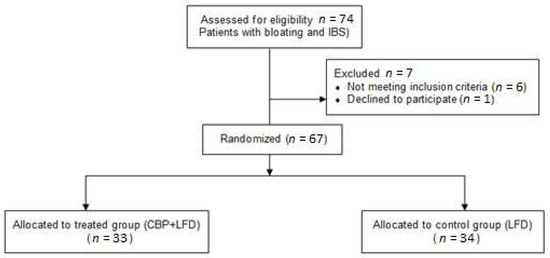 Seventy-four patients with bloating and IBS were screened, and 67 (90.5%), 51 females and 16 males, with mean (±SD) age of 43.09 (±15.10), were recruited and analyzed (Figure 1).