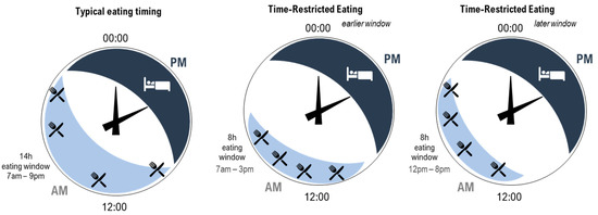 - Manoogian, E.N.; Chow, L.S.; Taub, P.R.; Laferrère, B.; Panda, S. Time-restricted eating for the prevention and management of metabolic diseases. Endocr. Rev. 2021, bnab027. [Google Scholar] [CrossRef]