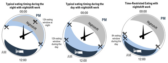 - Grant, C.L.; Coates, A.M.; Dorrian, J.; Kennaway, D.J.; Wittert, G.A.; Heilbronn, L.K.; Pajcin, M.; Della Vedova, C.; Gupta, C.C.; Banks, S. Timing of food intake during simulated night shift impacts glucose metabolism: A controlled study. Chronobiol. Int. 2017, 34, 1003–1013. [Google Scholar] [CrossRef] [PubMed]