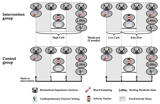 For 3 weeks, participants who were allocated to the intervention group pursued a HC diet according to the macronutrient composition: 75–80% carbohydrates, 15% proteins and 5–10% fat. The high carbohydrate content was achieved with complex carbohydrates, such as found in whole meal products, potatoes or brown rice, while carbohydrates consumed via sucrose and fructose were mainly avoided. After a wash-out period of approximately 3 weeks, the second intervention period started with a one-week lead-in phase of a LC diet (20–25% carbohydrates, 15% proteins, 60–65% fat) followed by a 2-week ketogenic diet (5–7% carbohydrates, 15% proteins, 80% fat). The diet consisted mainly of fish, meat, nuts, vegetables and dairy products. Participants were educated by a nutritionist what to eat during the HC and LC diets and example menus were provided. Additionally, they were instructed to keep the total calorie intake stable during both interventions. The adherence to the specific diet was verified by diet diaries, which were documented throughout both study periods for at least 1 week during each intervention. The control group followed an identical schedule of investigations but was not supposed to adhere to any nutritional advice and was allowed to eat and drink ad libitum. The study procedure is illustrated in Figure 1.