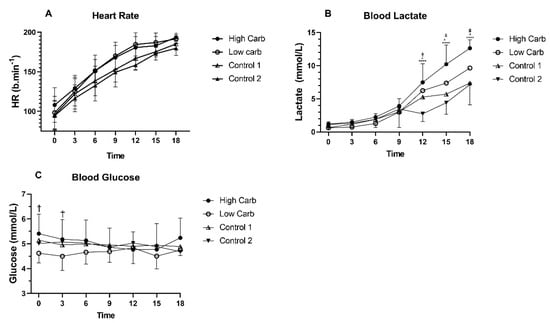 No significant differences were found between HC and LC for blood lactate levels during CPX testing. When compared to the control group, blood lactate was significantly increased after HC diet when compared to both CPX tests during the control phase 1 (Figure 2) (12 min: p = 0.03, 15 min: p= 0.002, 18 min: p < 0.0001) and control phase 2 (12 min p < 0.0001, 15 min: p < 0.0001, 18 min: p < 0.0001). No difference in LC and control phase 1 was found but in control phase 2 (12 min: p = 0.02, 15 min: p = 0.03, 18 min: p = 0.02) compared to LC (Figure 3B).