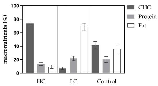 Caloric intake was significantly lower in HC compared to LC with 1739 ± 606 vs. 1939 ± 430 kcal/day (p = 0.02). Furthermore, average CHO intake was significantly higher in HC compared to LC with 74 ± 4 vs. 7 ± 2% of the entire daily energy intake. Consumed protein in % was significantly lower in HC compared to LC with 13.6 ± 2.3 vs. 22.1 ± 3.4% of daily intake. Fat intake was significantly lower in HC compared to LC with 9.8 ± 2.6 vs. 68.5 ± 5.5% of total energy intake. Further details on the distribution of macronutrients are given in Figure 4.