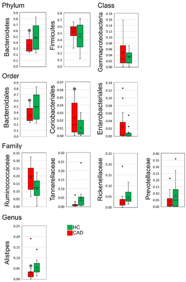 Figure 2. The most notable differences at the phylum, class, order, family and genus levels in the gut microbiome of CAD patients compared to healthy controls. The asterisks above bars indicate statistically significant differences (p < 0.05) between CAD and HC groups.