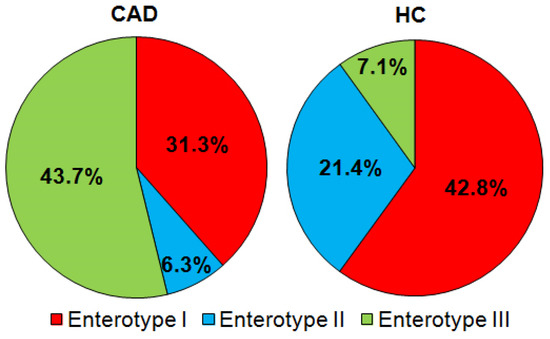 Figure 3. Enterotypes (%) distribution in CAD and HC groups. Enterotype I—Bacteroides prevalence; enterotype II—prevotella prevalence, and enterotype III Ruminococcus prevalence.