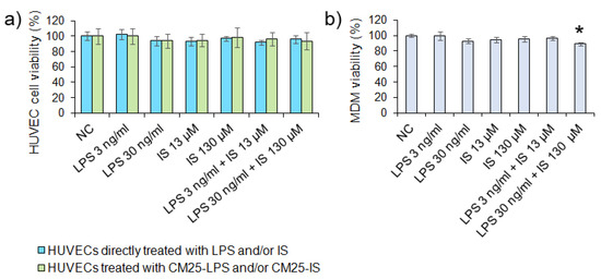 Figure 4. HUVECs and monocyte-derived macrophages (MDM) viability after stimulation with LPS and indoxyl sulfate (IS). (a) HUVECs and (b) MDM viability was assessed after 18 h with MTT. Data are means ± SEM of three independent experiments performed in triplicate. The asterisk above the bar indicates a statistically significant difference (p < 0.05).