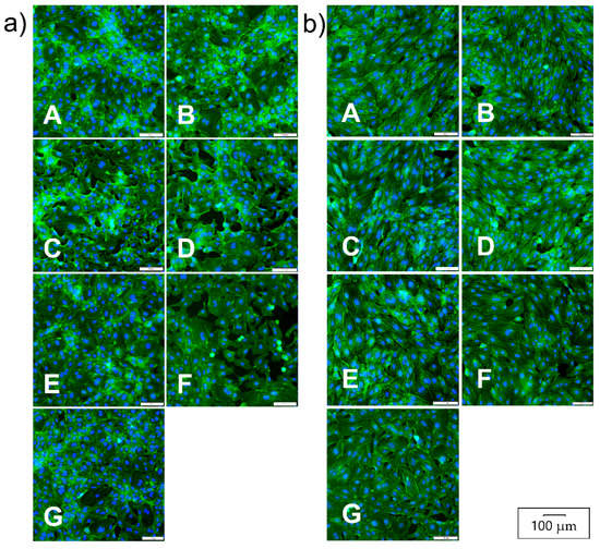 Figure 5. HUVECs morphology after stimulation with LPS and indoxyl. HUVECs were treated with LPS and IS or their combinations (a) or with conditioned medium from MDM (b) for 18 h. Fluorescence images present cells treated with LPS at 3 ng/mL and 30 ng/mL (Panels A,B); cells treated with indoxyl at 13 µM and 130 µM (Panels C,D); cells treated with LPS 3 ng/mL + IS 13 µM and LPS30 ng/mL + IS 130 µM (Panels E,F); and untreated cells (Panels G). Cells were stained with phalloidin-FITC and DAPI to visualize the cell’s actin filaments and nuclei, respectively.