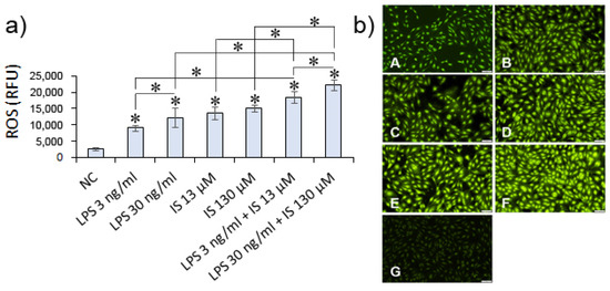 Figure 6. Reactive oxygen species (ROS) production. (a) HUVECs were treated for 5 h with LPS or IS or combined metabolites at appropriate concentrations. ROS was evaluated in HUVECs using a permeable probe H2DCF-DA compared to untreated cells (NC) as a negative control. Fluorescence intensity was read spectrophotometrically at Ex/EM = 488/525 nm. Data are presented as means ± SEM from three independent assays performed in triplicate. The asterisks above bars indicate statistically significant differences between negative control and metabolites examined. (b) ROS production was visualized in a fluorescent microscope. The image shows HUVECs treated with metabolites at the following concentrations: LPS 3 ng/mL and 30 ng/mL (panels A,B); IS 13 µM and 130 µM (panels C,D); LPS 3 ng/mL + IS 13 µM and LPS 30 ng/mL + IS 130 µM (panels E,F); and negative control (panel G).