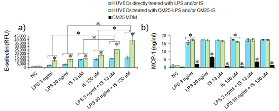 Figure 7. E-selectin and MCP-1 production in HUVECs stimulated with LPS and indoxyl. (a) E-selectin levels in HUVECs treated directly (blue bars) with LPS and IS or both metabolites and indirectly (green bars) with CM25-LPS/CM25-IS at appropriate concentrations. The asterisks above bars indicate the statistical differences in E-selectin levels between HUVECs stimulated directly with LPS/IS or indirectly with CM25. E-selectin was evaluated in HUVECs stimulated with LPS or IS or both bacterial metabolites for 18 h with FITC-conjugated mouse monoclonal anti-human E-selectin antibody. Data are presented as means ± SEM from two independent assays performed in quadruplicate. (b) MPC-1 levels in CM25 from MDM (black bars) and a culture media from HUVECs stimulated for 18 h with CM25 (green bars) or with LPS/IS (blue bars). The asterisks above black bars represent statistically significant differences between MCP-1 levels in CM25 and a culture media from HUVECs stimulated with LPS and IS for 18 h. The asterisks above white and grey bars indicate differences between MCP-1 levels in a culture media from HUVECs stimulated with CM25 and LPS/IS. MCP-1 was evaluated using the MCP-1 Human ELISA kit. Data are the means ± SEM from two independent assays performed in duplicate.