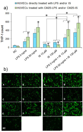 Figure 8. Monocyte adherence to HUVECs stimulated with LPS and indoxyl. (a) Quantitative THP-1 adherence to HUVECs treated directly (blue bars) with LPS/IS or indirectly (green bars) with CM25-LPS/CM25-IS at appropriate concentrations. The asterisks above bars indicate statistically significant differences between HUVECs treated directly and indirectly. The asterisks above white and grey bars indicate statistically significant differences between results for directly and indirectly treated cells. THP-1 cells stained with calcein-AM were incubated with HUVECs for 4 h and counted in a fluorescent microscope after washing out. (b) Fluorescence images of calcein-AM-stained monocytes adhering to HUVECs present HUVECs pretreated with LPS at 3 ng/mL and 30 ng/mL (panels A,B); cells treated with indoxyl at 13 µM and 130 µM (Panels C,D); cells treated with LPS 3 ng/mL + IS 13 µM and LPS30 ng/mL + IS 130 µM (Panels E,F); and untreated cells (NC).