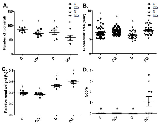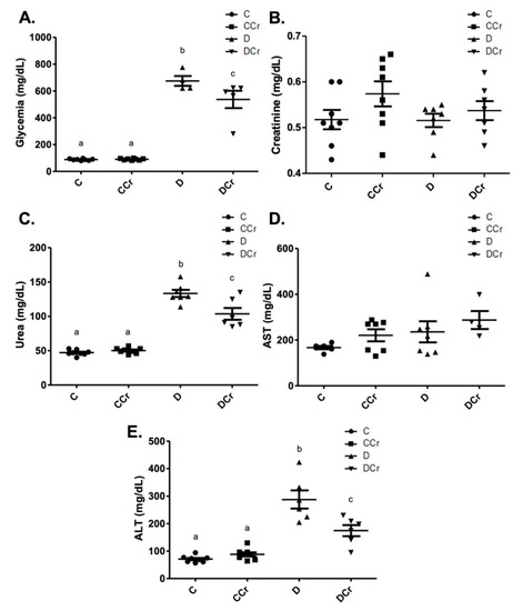 Gonçalves, M.G.; Medeiros, M.A.; de Lemos, L.I.C.; de Fátima Campos Pedrosa, L.; de Andrade Santos, P.P.; Abreu, B.J.; Lima, J.P.M.S. Effects of Creatine Supplementation on Histopathological and Biochemical Parameters in the Kidney and Pancreas of Streptozotocin-Induced Diabetic Rats. Nutrients 2022, 14, 431. https://doi.org/10.3390/nu14030431