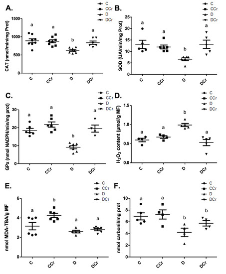 - Araújo, M.B.; Moura, L.P.; Junior, R.C.; Junior, M.C.; Dalia, R.A.; Sponton, A.C.; Ribeiro, C.; Mello, M.A. Creatine supplementation and oxidative stress in rat liver. J. Int. Soc. Sports Nutr. 2013, 10, 54. [Google Scholar] [CrossRef] [PubMed]