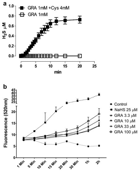 GRA is predominantly considered a biologically inert molecule [21], and its biological properties have been mostly attributed to SFN. However, in a recent work, Lucarini et al. found that GRA releases hydrogen sulfide (H2S) in a cysteine-dependent fashion, in a manner very similar to its cognate ITC, SFN [22,23], suggesting that GRA may be endowed with biological activity based on its H2S-releasing properties [24].
