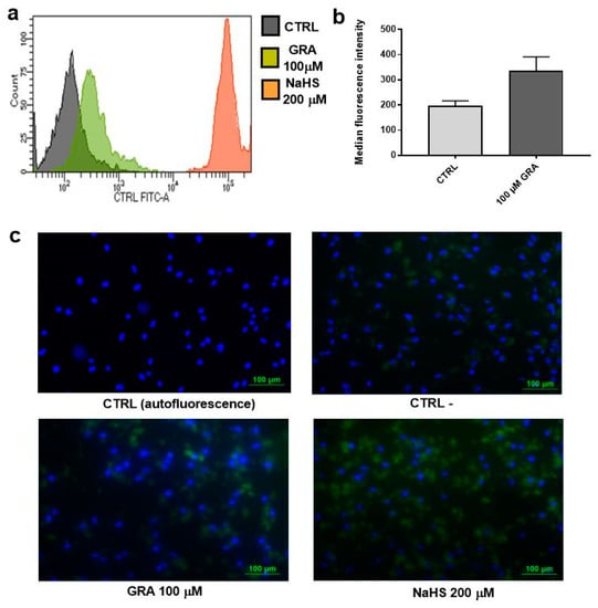 To further confirm that GRA increases H2S levels in hMSCs, and to exclude that fluorescent signal may derive, at least in part, from a leakage of the selective probe WSP-5 outside the cell membrane, we repeated the experiment by selecting the high concentration of 100 μM GRA, detaching the cell by trypsin treatment, and detecting intracellular H2S-specific fluorescence by flow cytometry. As shown in Figure 2a,b, GRA-treated cells showed a 1.5-fold increase in median fluorescence intensity compared with control, unstimulated cells, thereby confirming that intracellular H2S is increased upon GRA stimulation. As expected, NaHS used as positive control showed a much stronger increase in cell fluorescence signal. Finally, pictures of hMSCs treated with WSP-5 and the nuclear probe DAPI are shown in Figure 2c. Once again, GRA-treated cells showed a stronger fluorescence signal than unstimulated cells.