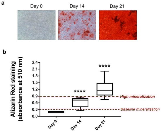 Mineral apposition in control osteogenic cultures of hMSCs. (a) Representative pictures of Alizarin Red staining in osteogenic cultures of hMSCs (magnification 100×). (b) Box plot showing the quantification of mineral apposition at day 0, day 14, and day 21 in control cells. Data are expressed as median ± min–max values of six independent experiments. Wilcoxon signed-rank test vs. 0.2 value (no mineralization) was performed for the statistical analysis (**** p < 0.0001 vs. control day 0).