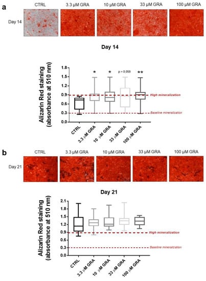 Mineral apposition in hMSCs after stimulation with GRA; Representative pictures (magnification 100×) and box plot showing the quantification of mineral apposition at day 14 (a) and day 21 (b) in hMSCs stimulated with 3.3–100 μM concentration of GRA (N = 6 independent experiments, showed as median, min—max values). One-way ANOVA and Dunnett’s multiple comparison tests were performed for the statistical analysis (* p < 0.05 and ** p < 0.01 vs. control day 14).