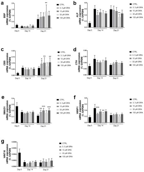 The effect of GRA on osteogenesis was also assessed on the mRNA expression of genes involved in osteoblastic differentiation of hMSCs. Figure 5 summarizes data from samples collected on days 0,14, and 21. Interestingly, GRA stimulation affected the expression of BSP, a member of the SIBLING (small, integrin-binding ligand N-linked glycoprotein) family of a protein implicated in the initiation of hydroxyapatite crystal formation in the bone matrix. At the same time, the levels of BSP increased over time with osteogenesis; at D21, all the concentrations of GRA further increased the expression of BSP, and the concentration of 33 μM showed a statistically significant upregulation of BSP. A similar pattern was observed for the expression of SMAD1, where GRA induced a significant increase in gene expression only at the late time point D21 at the concentrations of 3.3, 10, and 100 μM. GRA was also shown to significantly affect the expression of CBS, one of the key enzymes implicated in the endogenous production of H2S, at day 21. A trend towards upregulation of gene expression after GRA stimulation was also observed for WNT16 at day 21, but due to high variability among different samples, it did not reach statistical significance. Occasional downregulations were observed upon GRA stimulation in the expression of ALP (at both D14 and D21) and WISP1 (at D14). It should be noted that both ALP and WISP-1 showed a strong upregulation in gene expression in unstimulated samples at D14 in this model.