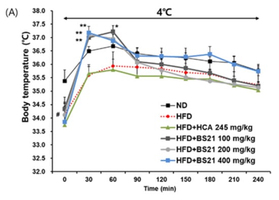 The animals were transferred to a cold chamber at an ambient temperature (4 °C) for the cold tolerance test. The rectal temperature during the cold tolerance test was measured using a TH-8 Thermalert Monitoring Thermometer (Physitemp, Clifton, NJ, USA) for 3 h in the cold chamber. The mice were sedated and restrained for < 30 s during the measurement. BS21 samples were orally administered to mice and the rectal temperature was determined at 0, 30, 60, 90, 120, and 180 min after BS21 treatment.