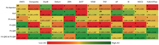 Effect of the intra-amniotic administration of treatments and controls on duodenal gene expression. Values are the means (AU: arbitrary units) ± SEM, n = 6. a,b genes (column wise) not indicated by the same letter are significantly different (p < 0.05). DMT1, Divalent metal transporter 1; Dcytb, duodenal cytochrome b; ZIP6, Zrt-, Irt-like proteins; ZnT7, zinc transporter 7; NF-κβ, nuclear factor kappa B; TNF-α, tumor necrosis factor; AP, Aminopeptidase; SI, Sucrose isomaltase; MUC2, mucin 2; Q3G, quercetin 3-glucoside; QSF, quinoa soluble fiber.