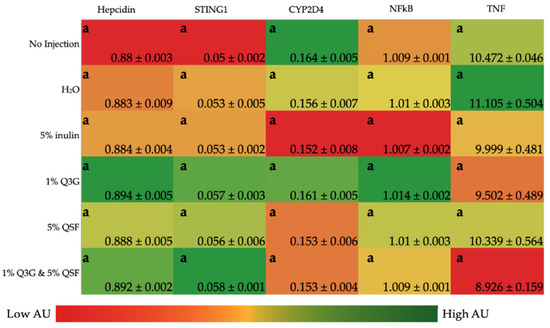 Effect of the intra-amniotic administration of treatments and controls on liver gene expression. Values are the means (AU: arbitrary units) ± SEM, n = 6. Values (column wise) are not statistically significant (p < 0.05). STING1, stimulator of interferon genes; Cyp2d4, cytochrome P450, family 2, subfamily d, polypeptide 4; NF-κβ, nuclear factor kappa beta; TNF-α, tumor necrosis factor. Q3G, quercetin 3-glucoside; QSF, quinoa soluble fiber.