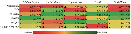 Figure 3 shows the relative abundance of probiotic Bifidobacterium, Lactobacillus and Lactiplantibacillus plantarum. Additionally, the relative abundance of Clostridium and E. coli (generally regarded as pathogenic bacteria) was measured. It was found that 5% inulin treatment, a known prebiotic, increased the populations of all bacterial groups assessed versus no injection control. A total of 5% QSF proved to be comparable to prebiotic inulin for its effects on the bacteria assessed. Interestingly, 1% Q3G and 5% QSF treatment groups showed a significant reduction in E. coli populations and a significant increase in Clostridium numbers compared to the controls.