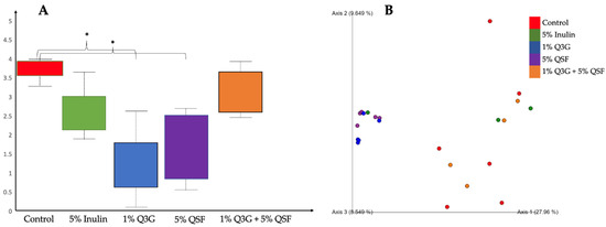 Cecum bacterial population analysis. (A) Measure of α-diversity using Shannon’s diversity index, the q value was established using Kruskal–Wallis (pairwise) test; (B) Principal Coordinate analysis (PCoA) showing β-diversity using the Bray–Curtis index, PERMANOVA (pairwise) test for statistical significance. n~5, * = q < 0.05. Q3G, quercetin 3-glucoside; QSF, quinoa soluble fiber.
